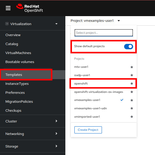 To begin, click on Templates in the left-side menu, and select openshift for your project. You may need to toggle the Show default projects button in order for the openshift project to appear.