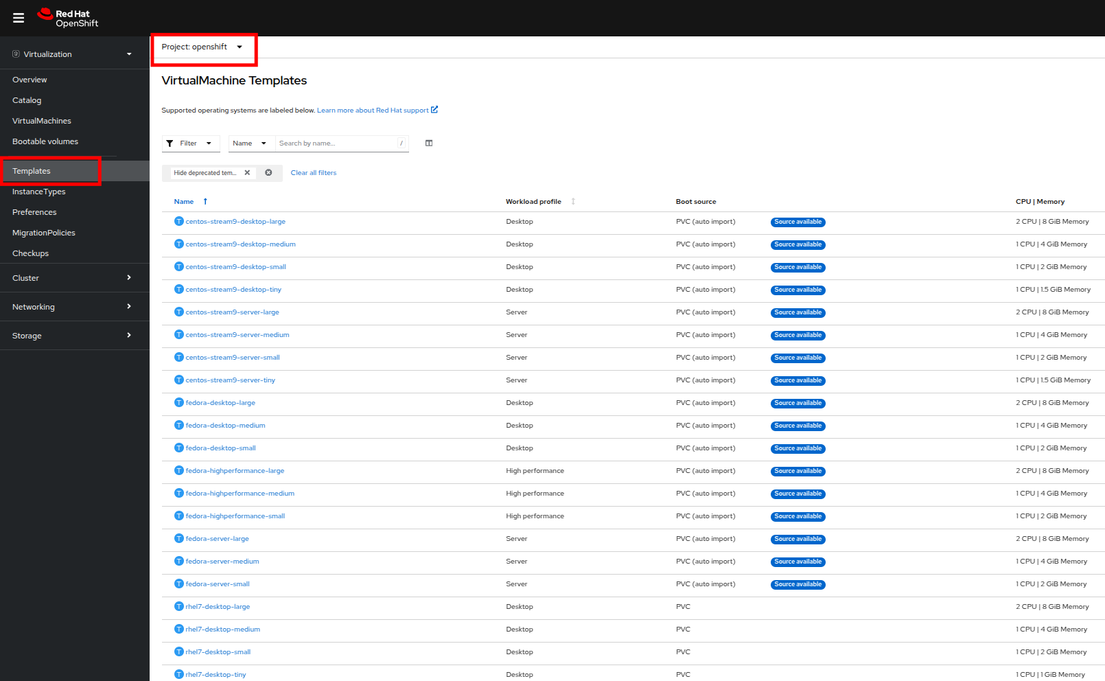 Pre-configured Red Hat virtual machine templates are listed under Virtualization on the Templates page. These templates are available for different versions of Red Hat Enterprise Linux, Fedora, CentOS, Microsoft Windows Desktop, and Microsoft Windows Server editions. Each Red Hat associated virtual machine template is preconfigured with an operating system image (boot source), the default settings for the operating system, the flavor (CPU and memory), and the workload type (server). The templates for other operating systems do not include OS images, but are preconfigured as recommended for their operating system.