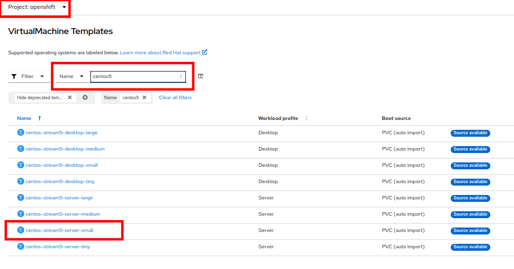 In the search bar type in centos9 and press Enter. In the list of templates that appear find the template for centos-stream9-server-small.