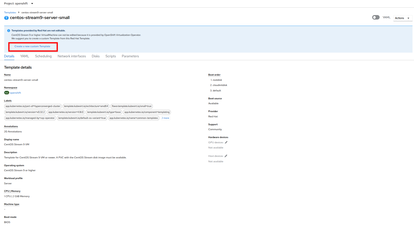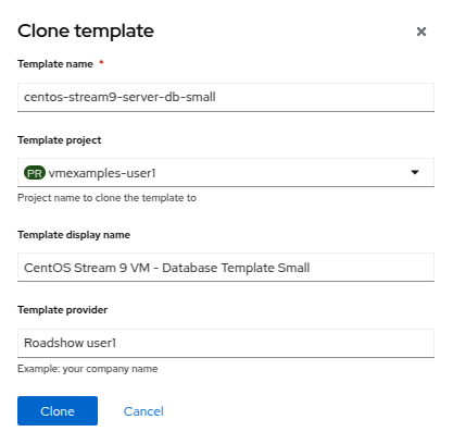 Click on the template name for centos-stream9-server-small, you will be prompted with a message that default templates cannot be edited and asked if you’d like to clone. Click the Create a new custom Template option.