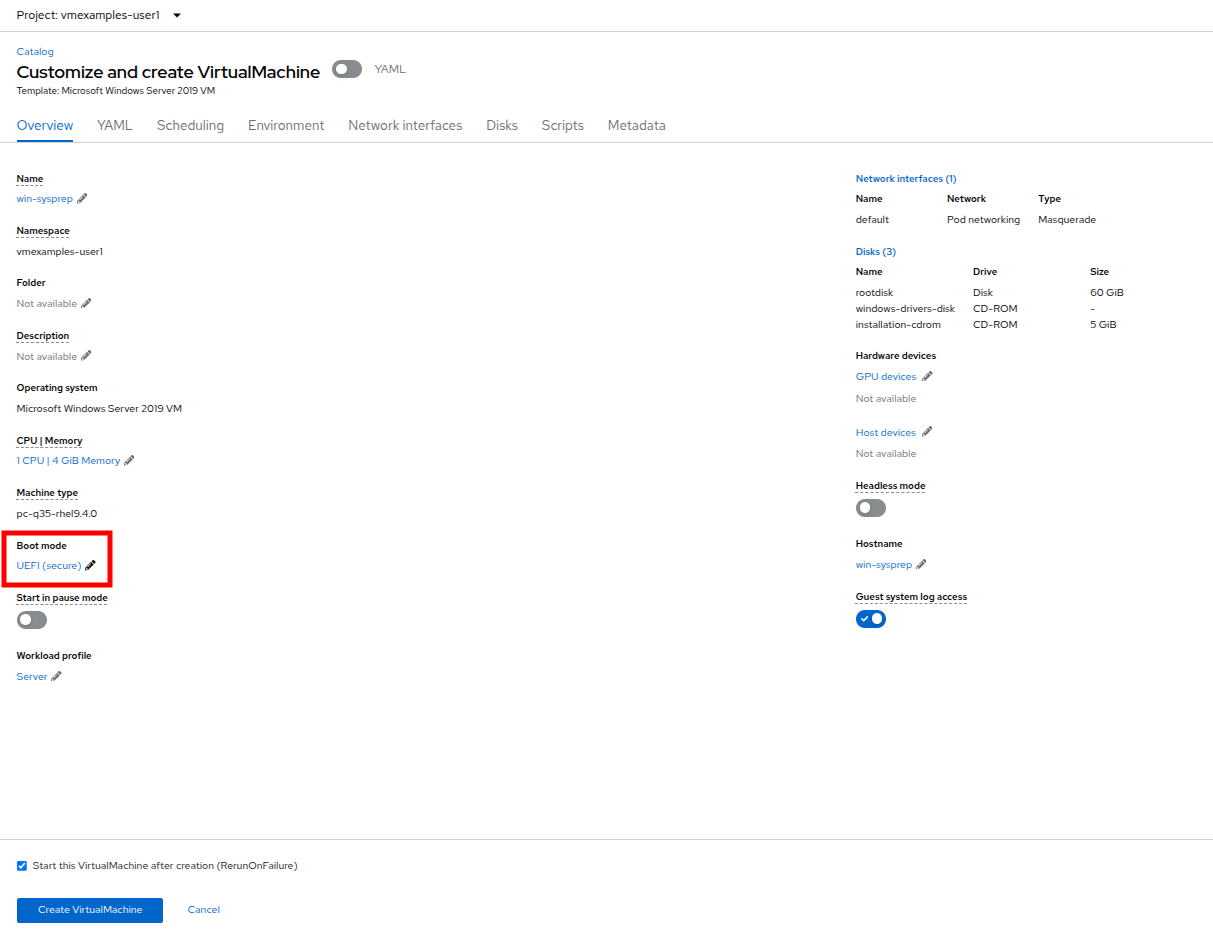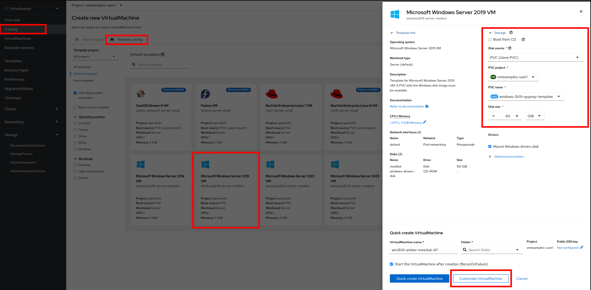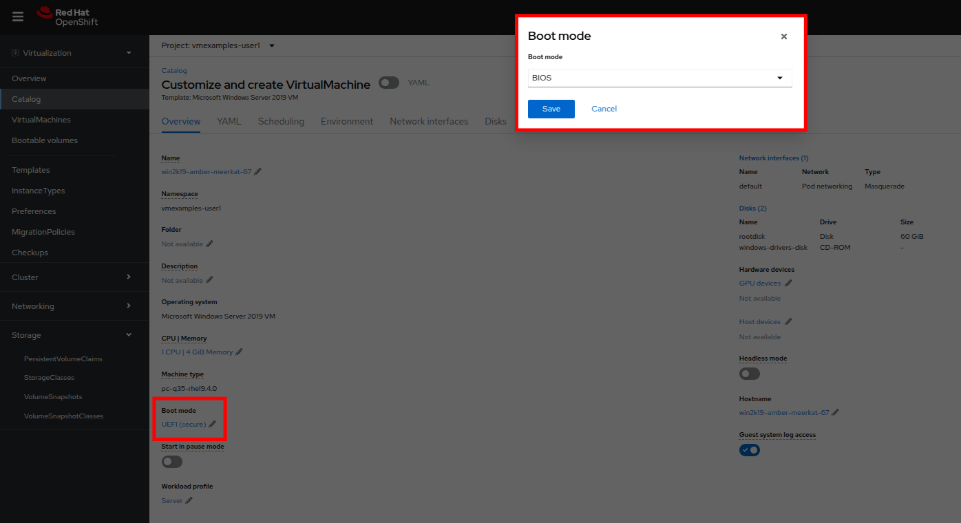 Return to the Catalog menu item, and use this cloned PVC as a boot source for quick-creating new virtual machines by selecting the option for PVC (clone PVC) as the Disk source, and selecting the Windows-2k19-Sysprep-Template PVC as the PVC name to clone, and click the Customize VirtualMachine button to configure boot mode BIOS instead UEFI.
