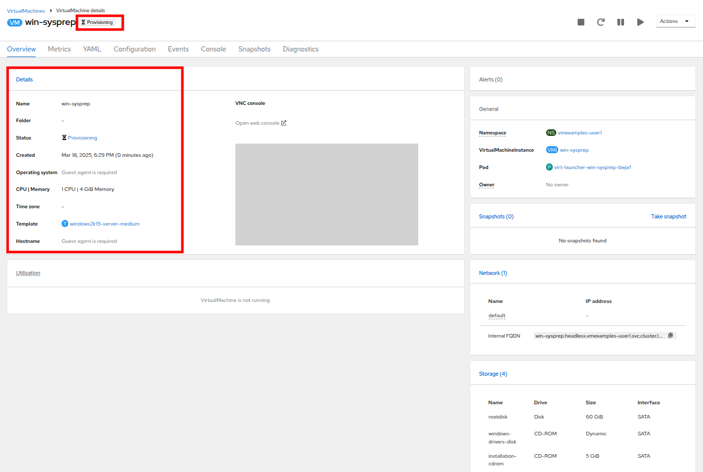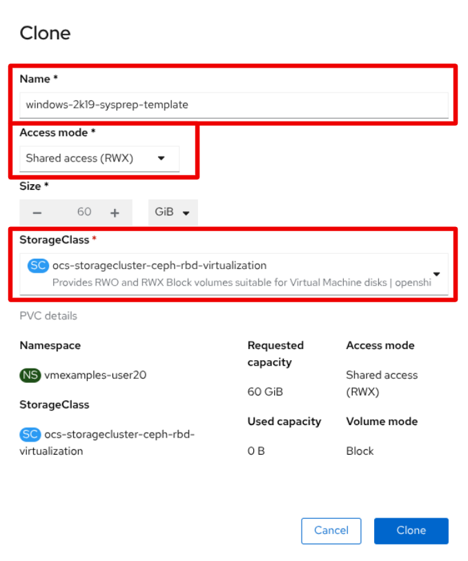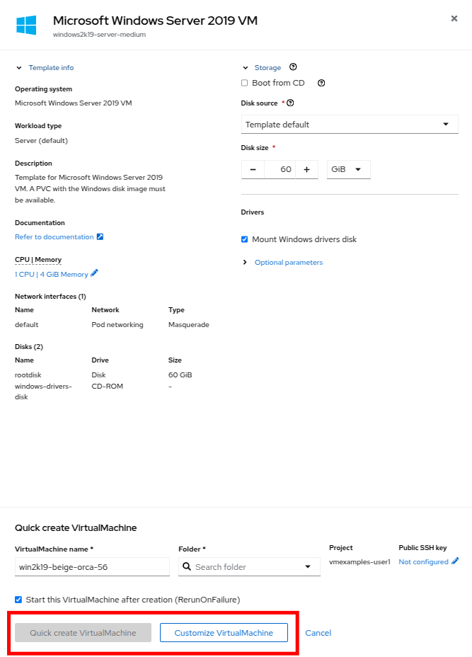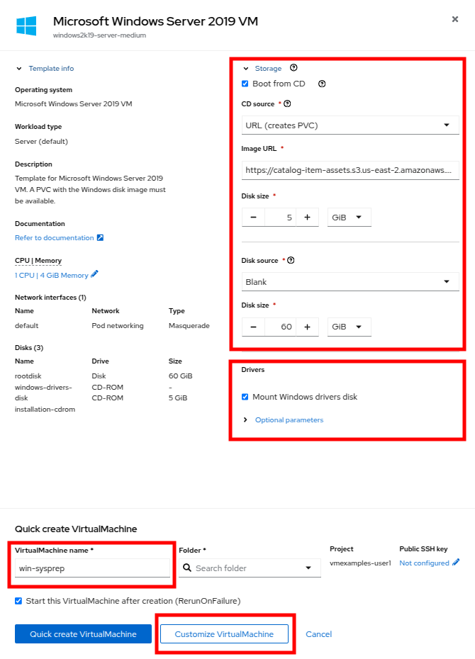 Return to the Catalog menu item, and use this cloned PVC as a boot source for quick-creating new virtual machines by selecting the option for PVC (clone PVC) as the Disk source, and selecting the Windows-2k19-Sysprep-Template PVC as the PVC name to clone, and click the Customize VirtualMachine button to configure boot mode BIOS instead UEFI.