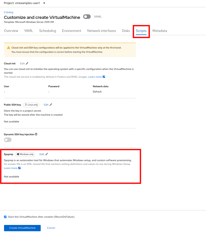 With the Sysprep in place, click the Create VirtualMachine button at the bottom of the screen.