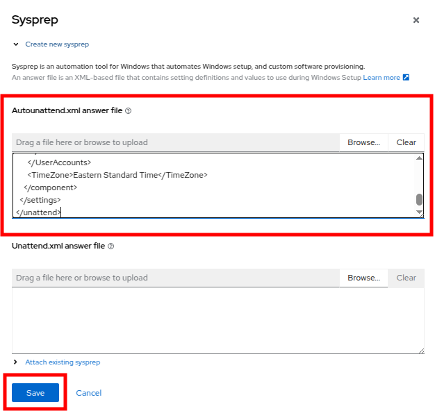<?xml version="1.0" encoding="utf-8"?> <unattend xmlns="urn:schemas-microsoft-com:unattend" xmlns:wcm="http://schemas.microsoft.com/WMIConfig/2002/State" xmlns:xsi="http://www.w3.org/2001/XMLSchema-instance" xsi:schemaLocation="urn:schemas-microsoft-com:unattend"> <settings pass="windowsPE"> <component name="Microsoft-Windows-Setup" processorArchitecture="amd64" publicKeyToken="31bf3856ad364e35" language="neutral" versionScope="nonSxS"> <DiskConfiguration> <Disk wcm:action="add"> <CreatePartitions> <CreatePartition wcm:action="add"> <Order>1</Order> <Extend>true</Extend> <Type>Primary</Type> </CreatePartition> </CreatePartitions> <ModifyPartitions> <ModifyPartition wcm:action="add"> <Active>true</Active> <Format>NTFS</Format> <Label>System</Label> <Order>1</Order> <PartitionID>1</PartitionID> </ModifyPartition> </ModifyPartitions> <DiskID>0</DiskID> <WillWipeDisk>true</WillWipeDisk> </Disk> </DiskConfiguration> <ImageInstall> <OSImage> <InstallFrom> <MetaData wcm:action="add"> <Key>/IMAGE/NAME</Key> <Value>Windows Server 2019 SERVERSTANDARD</Value> </MetaData> </InstallFrom> <InstallTo> <DiskID>0</DiskID> <PartitionID>1</PartitionID> </InstallTo> </OSImage> </ImageInstall> <UserData> <AcceptEula>true</AcceptEula> <FullName>Administrator</FullName> <Organization>My Organization</Organization> </UserData> <EnableFirewall>false</EnableFirewall> </component> <component name="Microsoft-Windows-International-Core-WinPE" processorArchitecture="amd64" publicKeyToken="31bf3856ad364e35" language="neutral" versionScope="nonSxS"> <SetupUILanguage> <UILanguage>en-US</UILanguage> </SetupUILanguage> <InputLocale>en-US</InputLocale> <SystemLocale>en-US</SystemLocale> <UILanguage>en-US</UILanguage> <UserLocale>en-US</UserLocale> </component> </settings> <settings pass="offlineServicing"> <component name="Microsoft-Windows-LUA-Settings" processorArchitecture="amd64" publicKeyToken="31bf3856ad364e35" language="neutral" versionScope="nonSxS"> <EnableLUA>false</EnableLUA> </component> </settings> <settings pass="specialize"> <component name="Microsoft-Windows-Shell-Setup" processorArchitecture="amd64" publicKeyToken="31bf3856ad364e35" language="neutral" versionScope="nonSxS"> <AutoLogon> <Password> <Value>R3dh4t1!</Value> <PlainText>true</PlainText> </Password> <Enabled>true</Enabled> <LogonCount>999</LogonCount> <Username>Administrator</Username> </AutoLogon> <OOBE> <HideEULAPage>true</HideEULAPage> <HideLocalAccountScreen>true</HideLocalAccountScreen> <HideOnlineAccountScreens>true</HideOnlineAccountScreens> <HideWirelessSetupInOOBE>true</HideWirelessSetupInOOBE> <NetworkLocation>Work</NetworkLocation> <ProtectYourPC>3</ProtectYourPC> <SkipMachineOOBE>true</SkipMachineOOBE> </OOBE> <UserAccounts> <LocalAccounts> <LocalAccount wcm:action="add"> <Description>Local Administrator Account</Description> <DisplayName>Administrator</DisplayName> <Group>Administrators</Group> <Name>Administrator</Name> </LocalAccount> </LocalAccounts> </UserAccounts> <TimeZone>Eastern Standard Time</TimeZone> </component> </settings> <settings pass="oobeSystem"> <component name="Microsoft-Windows-International-Core" processorArchitecture="amd64" publicKeyToken="31bf3856ad364e35" language="neutral" versionScope="nonSxS"> <InputLocale>en-US</InputLocale> <SystemLocale>en-US</SystemLocale> <UILanguage>en-US</UILanguage> <UserLocale>en-US</UserLocale> </component> <component name="Microsoft-Windows-Shell-Setup" processorArchitecture="amd64" publicKeyToken="31bf3856ad364e35" language="neutral" versionScope="nonSxS"> <AutoLogon> <Password> <Value>R3dh4t1!</Value> <PlainText>true</PlainText> </Password> <Enabled>true</Enabled> <LogonCount>999</LogonCount> <Username>Administrator</Username> </AutoLogon> <OOBE> <HideEULAPage>true</HideEULAPage> <HideLocalAccountScreen>true</HideLocalAccountScreen> <HideOnlineAccountScreens>true</HideOnlineAccountScreens> <HideWirelessSetupInOOBE>true</HideWirelessSetupInOOBE> <NetworkLocation>Work</NetworkLocation> <ProtectYourPC>3</ProtectYourPC> <SkipMachineOOBE>true</SkipMachineOOBE> </OOBE> <UserAccounts> <LocalAccounts> <LocalAccount wcm:action="add"> <Description>Local Administrator Account</Description> <DisplayName>Administrator</DisplayName> <Group>Administrators</Group> <Name>Administrator</Name> </LocalAccount> </LocalAccounts> </UserAccounts> <TimeZone>Eastern Standard Time</TimeZone> </component> </settings> </unattend> -