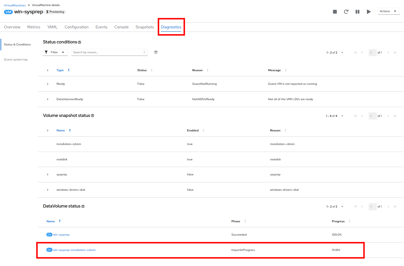 This process may take a few minutes due to needing to download the boot ISO image. You can check on the progress of the download by clicking the Diagnostics tab.
