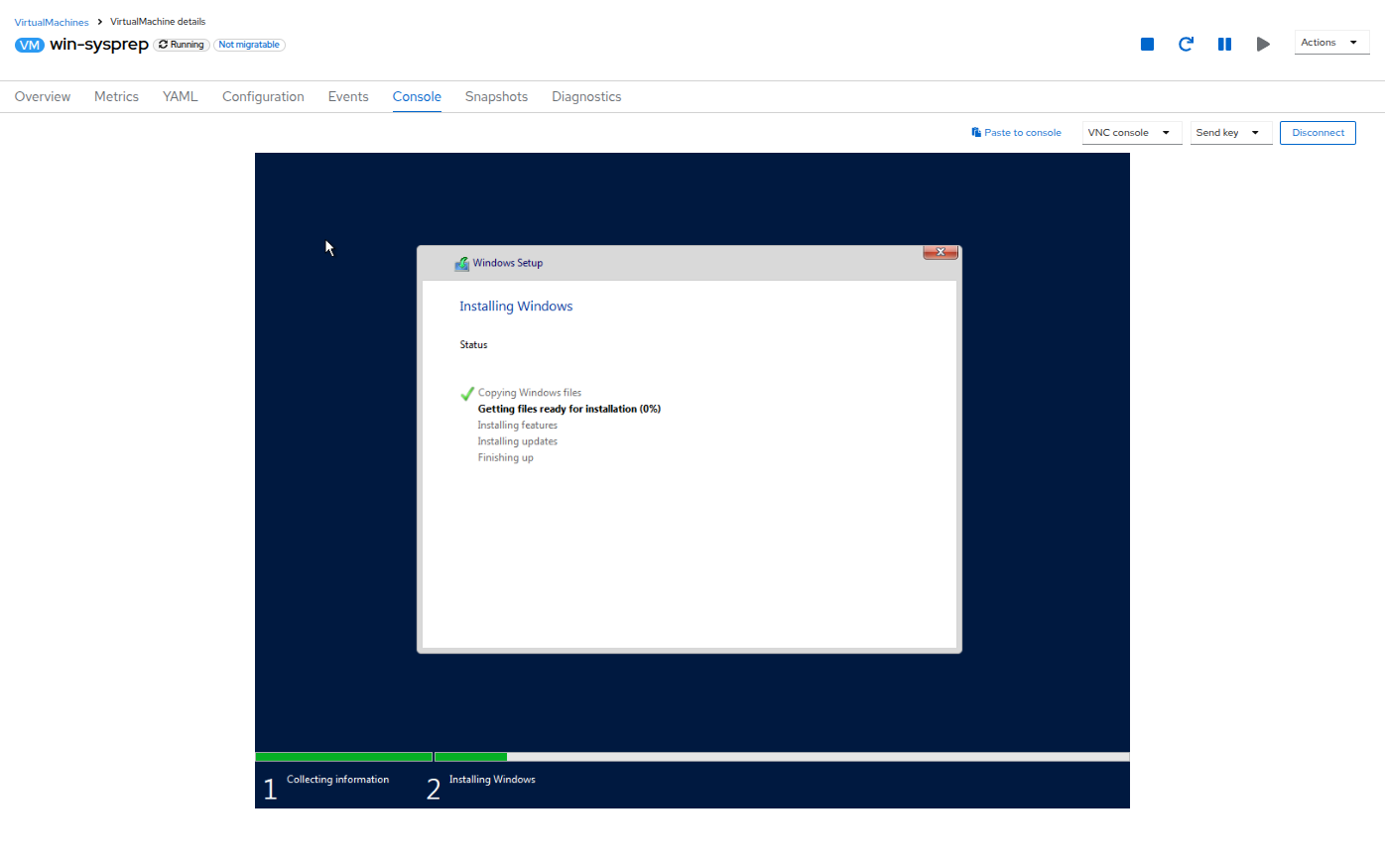 After a few moments, the virtual machine will start, and the status will change to Running. Click to the Console tab to view the autoattend installation process: