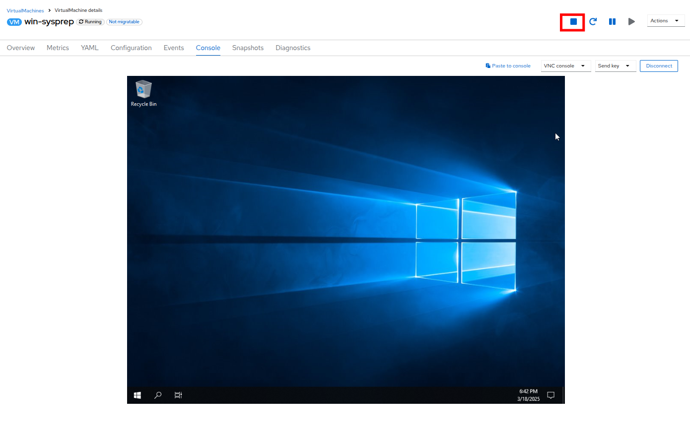 Once the VM installation process is complete (provisioning will take 3-5 minutes, starting and configuring will take about 10 minutes), go ahead and power it off with the stop button.