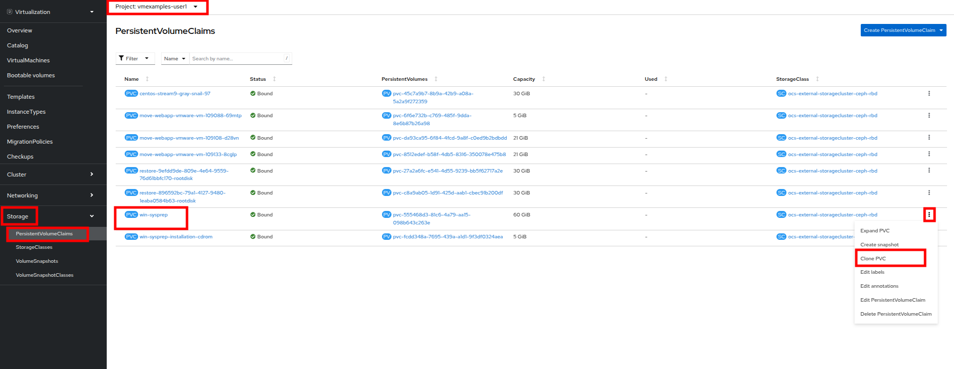 Find the win-sysprep PVC created with our installation, and using the three-dot menu on the right select Clone PVC.