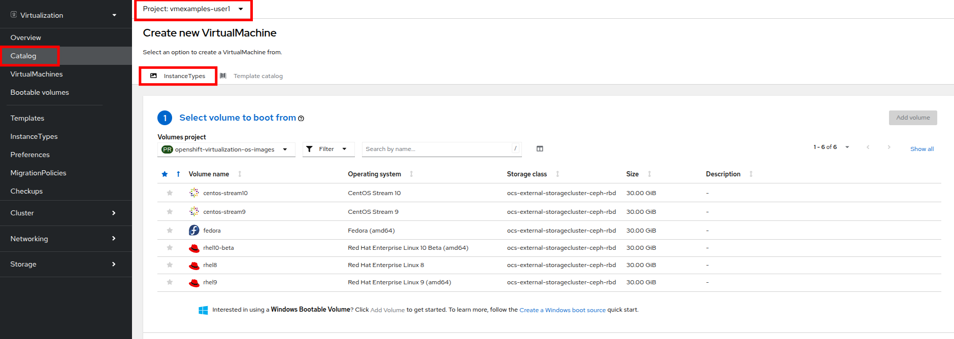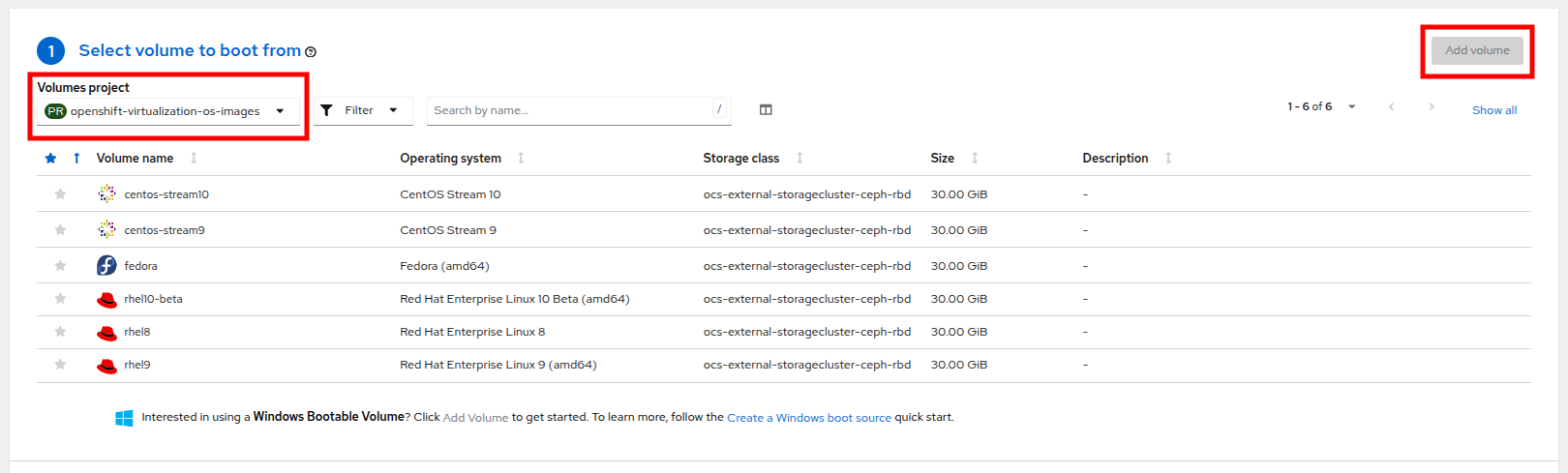 The first step in using an instance type is to select a volume to boot from. Similar to the templates that provide boot sources, these boot sources are available to use for guests provisioned with an InstanceType. You can see the included volumes by selecting the openshift-virtualization-os-images project, or you can upload your own with the Add volume button.
