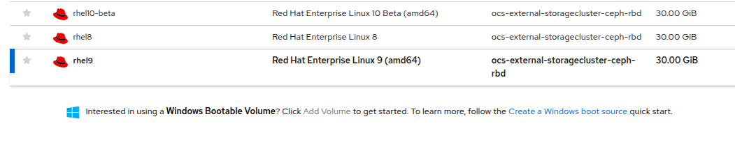Click on the rhel9 boot volume to select it as the volume type to boot from. Selecting it will be denoted by a small vertical blue line to the left of the image name and the name itself being changed to a bold font.